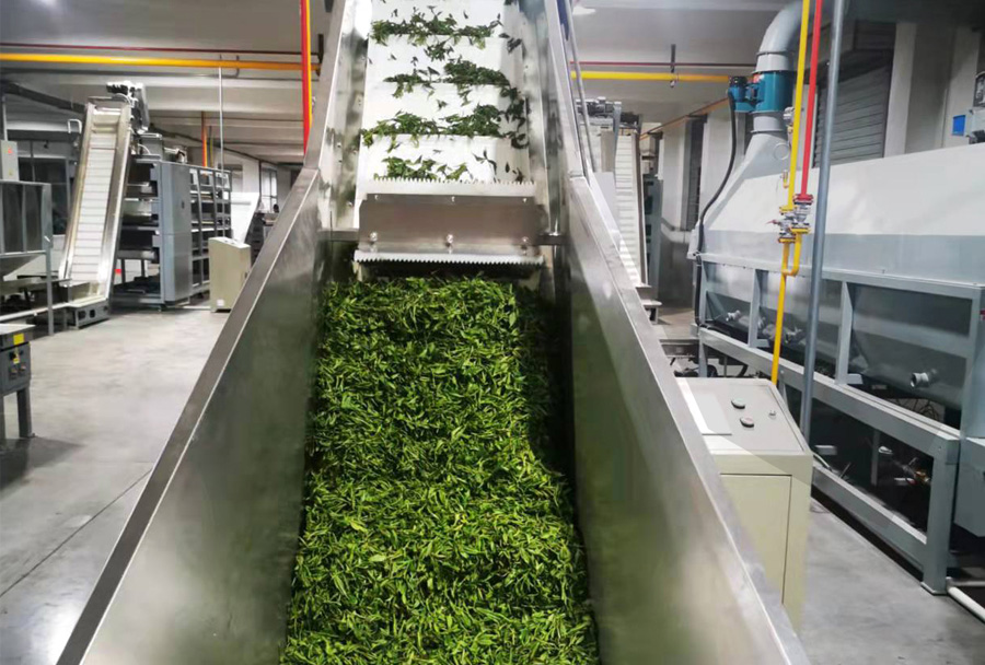 茶葉輸送機是茶葉加工生產(chǎn)線的重要組成部分,分皮帶式、振動槽式等,可平面輸送、高低錯位輸送,根據(jù)需要再配套勻葉、清理、調(diào)速、除塵等裝置,在整個生產(chǎn)線中起到連接主機、控制產(chǎn)能、平衡流量等功能,是生產(chǎn)線實現(xiàn)不落地、清潔化生產(chǎn)必不可少的配套設(shè)備。
